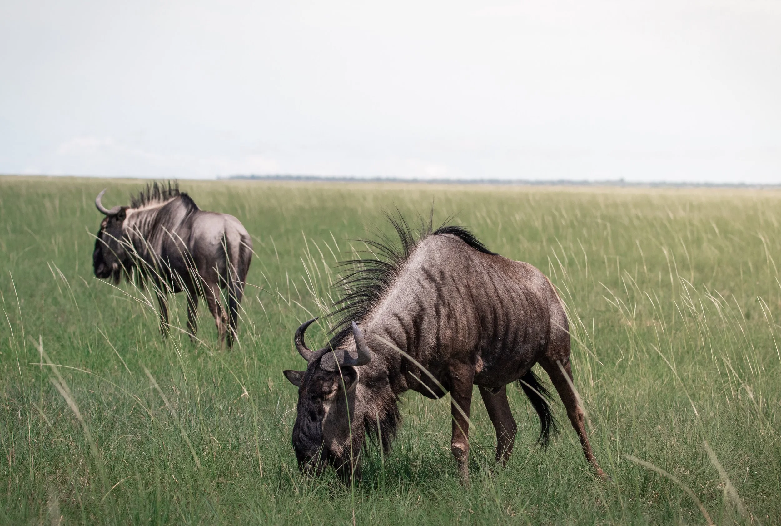 Two wildebeest standing in the middle of nowhere — surrounded by nothing but endless grasslands during the rainy season in Etosha National Park, Namibia.