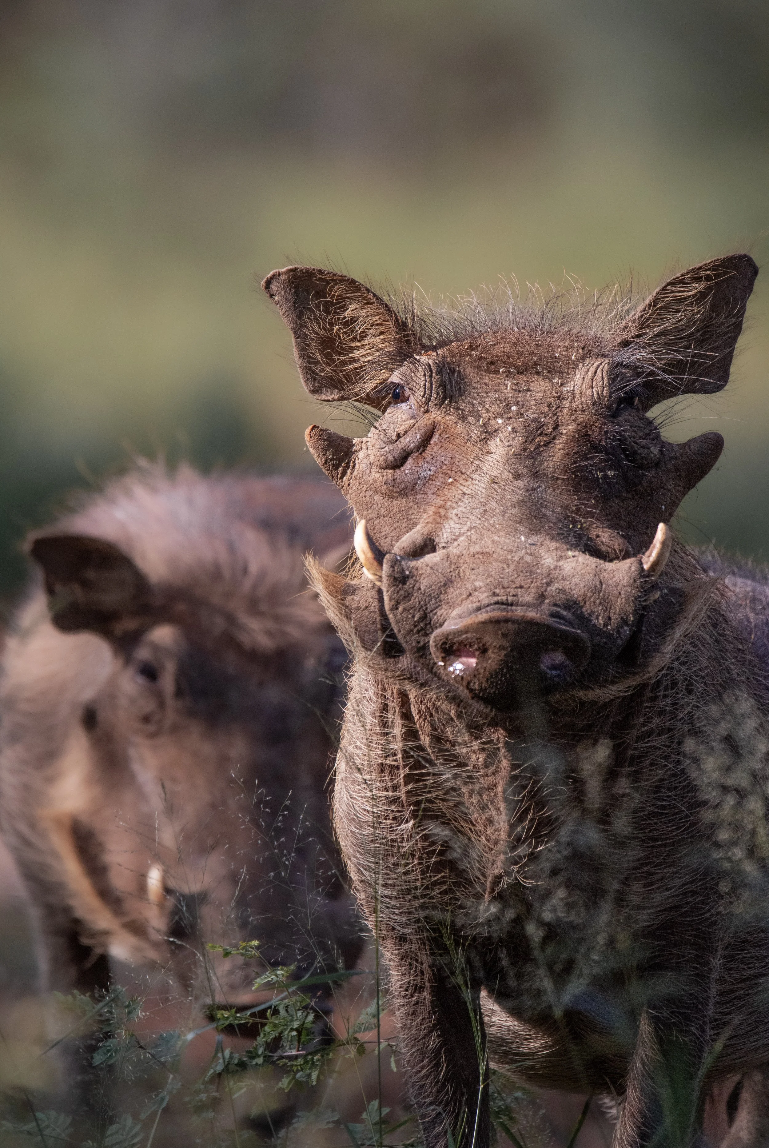 A male and female warthog, face to face with the camera in the dense bush of Namibia.
